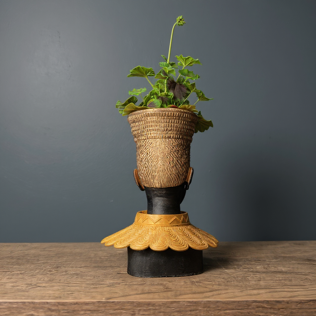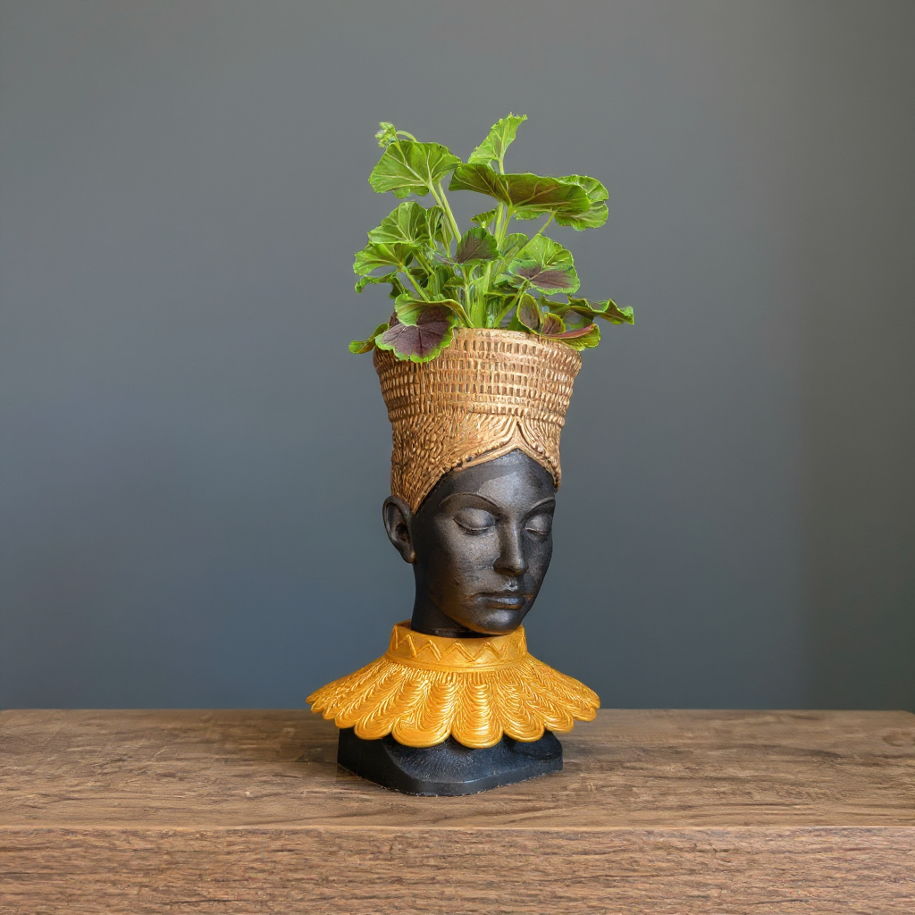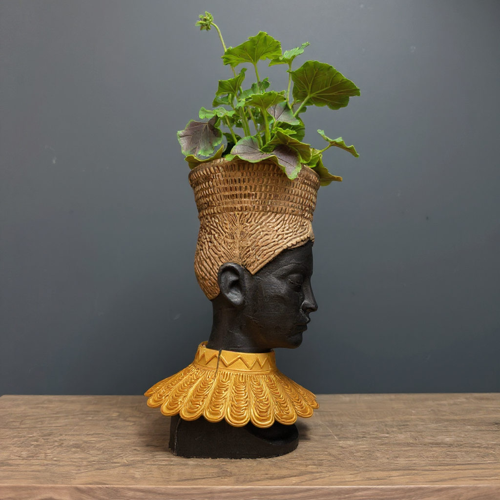 Discover our captivating African Head Planter, a truly unique art pot meticulously handcrafted to bring an air of sophisticated, tribal decor to your home. This stunning gold planter, featuring elegant black accents and an intricately designed gold PLA headdress, is more than just a concrete planter; it's a profound piece of black woman bust sculpture. Imagine this exquisite face planter or unique vase becoming the focal point of your indoor decor, a testament to handcrafted quality and artistic detail. Perfect as an indoor plant pot for your cherished greenery or as a standalone statement piece.