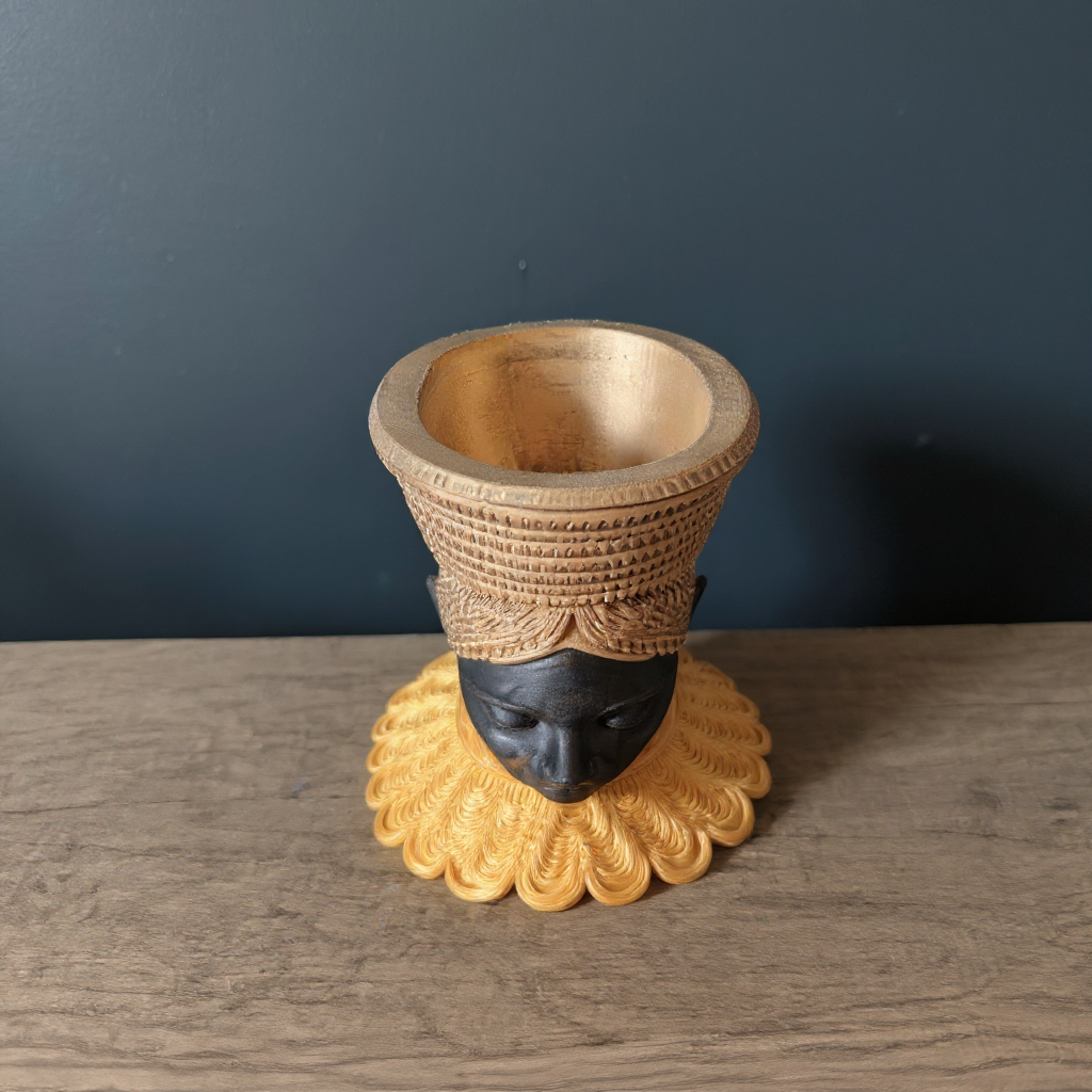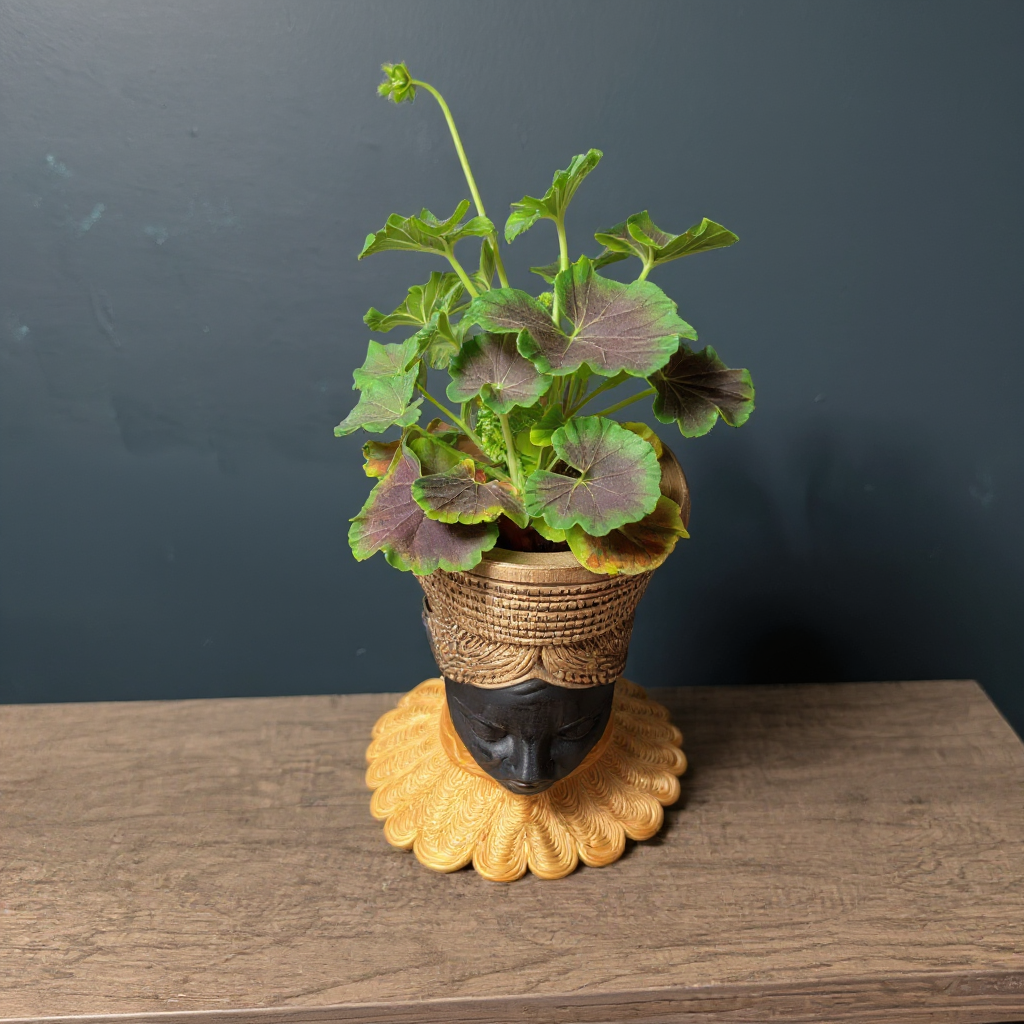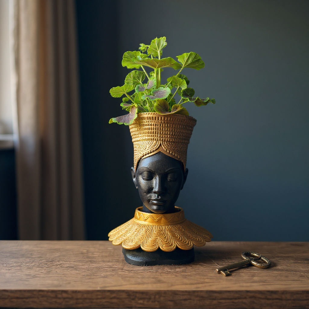 Discover our captivating African Head Planter, a truly unique art pot meticulously handcrafted to bring an air of sophisticated, tribal decor to your home. This stunning gold planter, featuring elegant black accents and an intricately designed gold PLA headdress, is more than just a concrete planter; it's a profound piece of black woman bust sculpture. Imagine this exquisite face planter or unique vase becoming the focal point of your indoor decor, a testament to handcrafted quality and artistic detail. Perfect as an indoor plant pot for your cherished greenery or as a standalone statement piece.