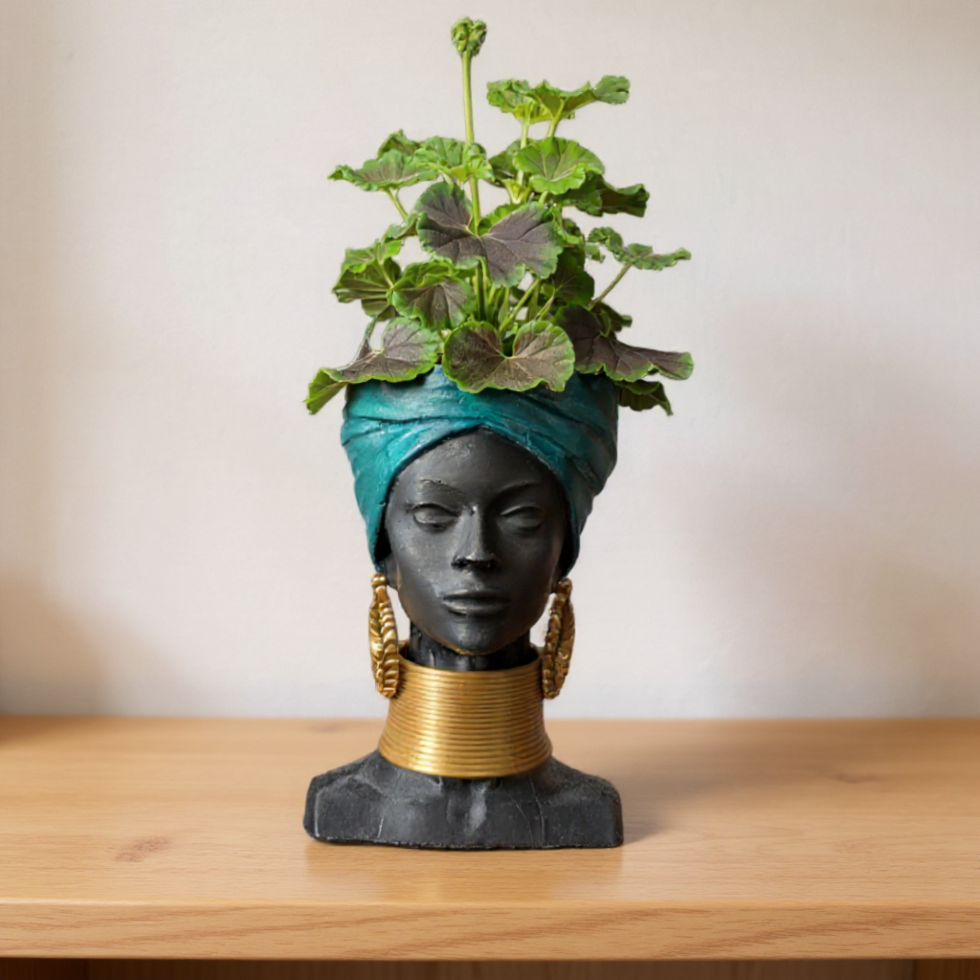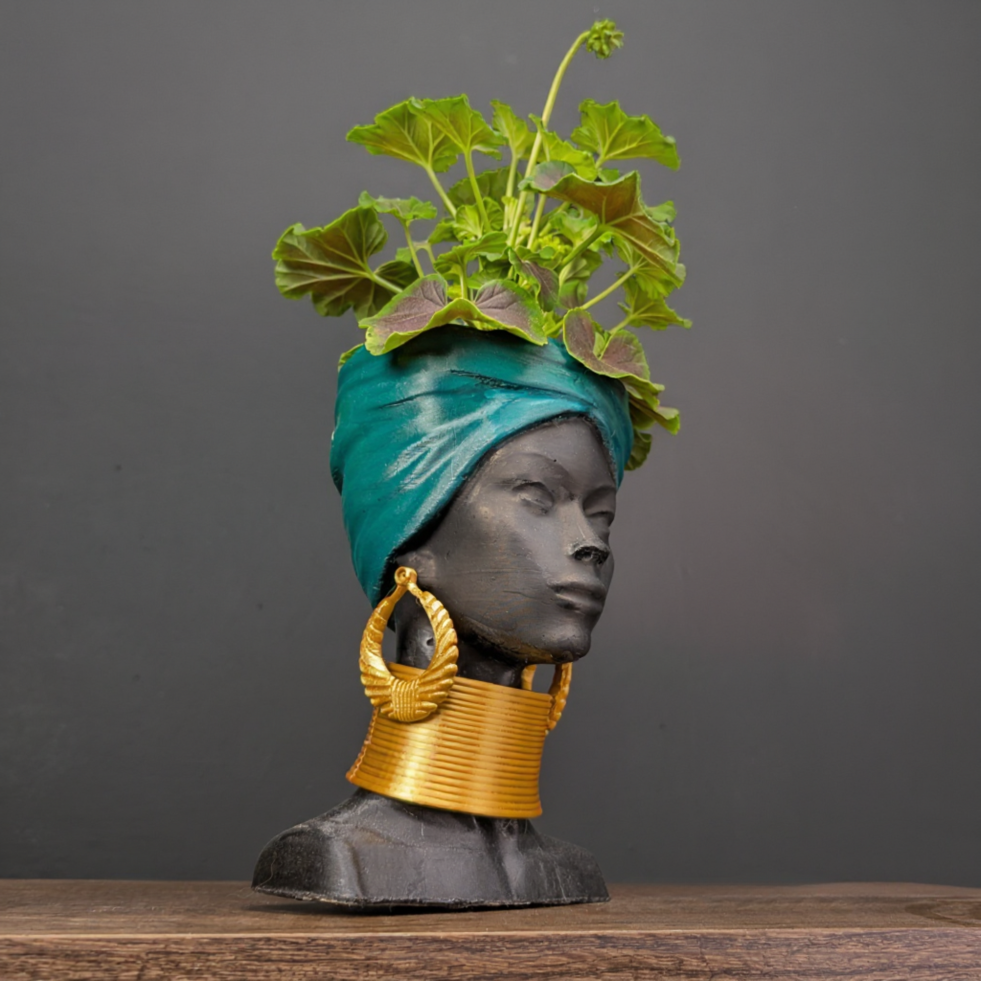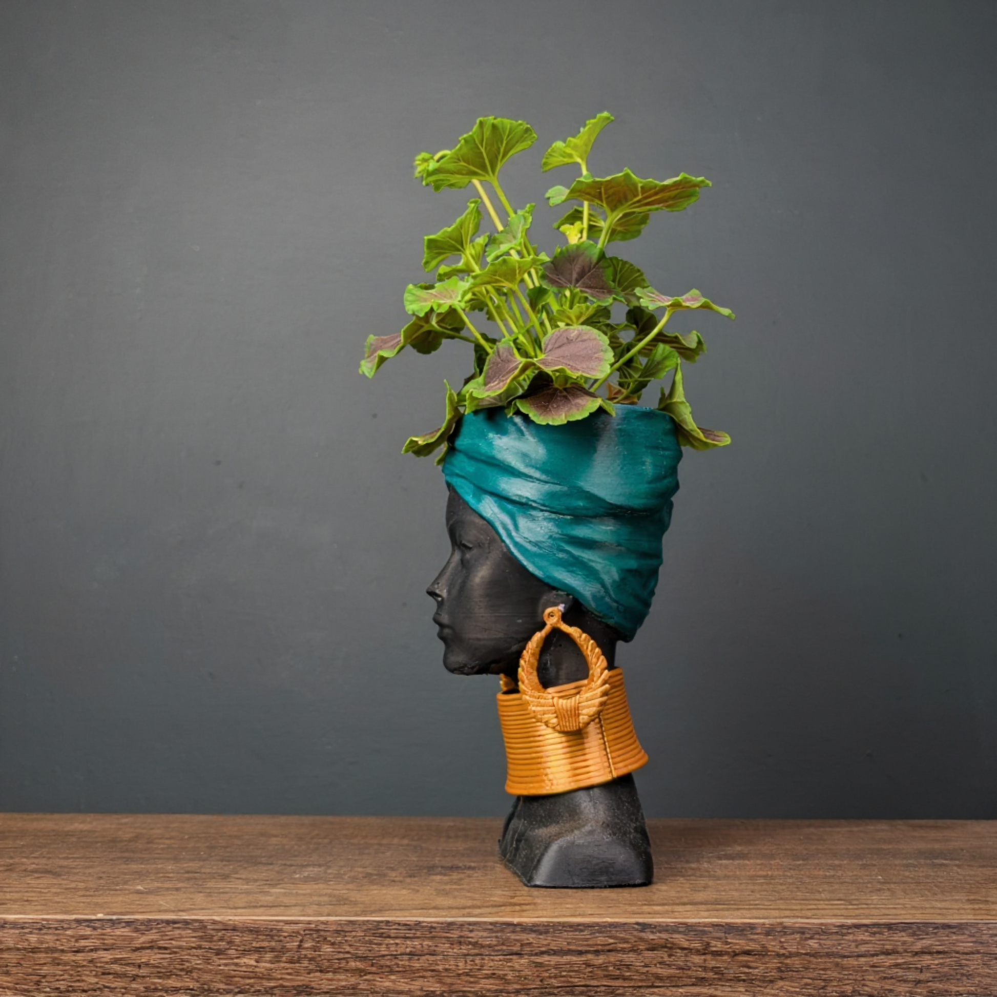 Oh, hello there, design-discerning friend! Ripley here, and I've flown in with a truly exceptional find for your nest. This captivating African woman head planter, a unique face planter pot, is a masterpiece of modern home decor. With her serene expression, striking teal headwrap, and elegant gold coloured PLA jewellery, she’s far more than just a planter pot; she's an aesthetic sculpture, a woman bust ready to transform your space. She is an ideal sculpture planter and statue planter, bringing artisan crafted beauty and tribal decor influences into your home.
