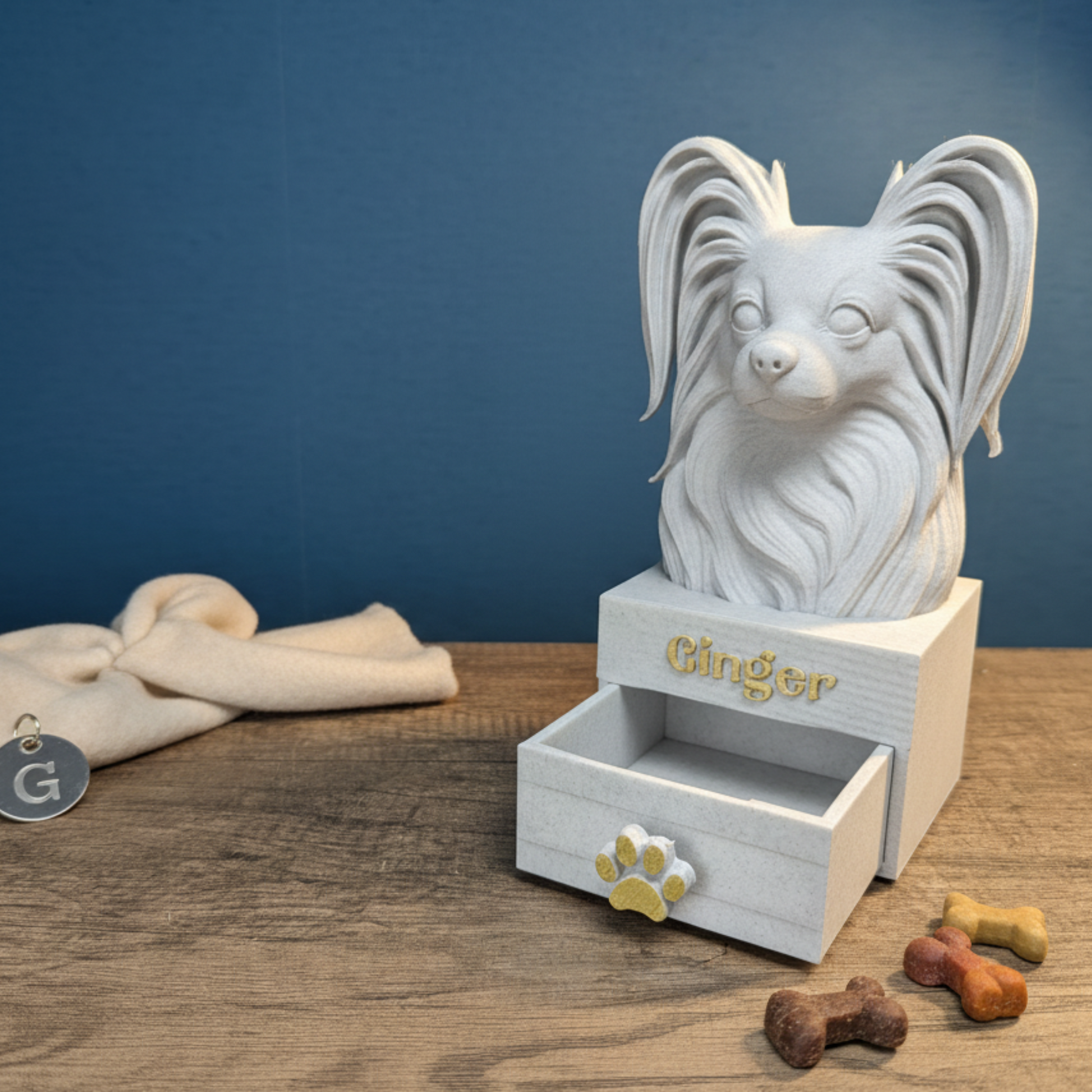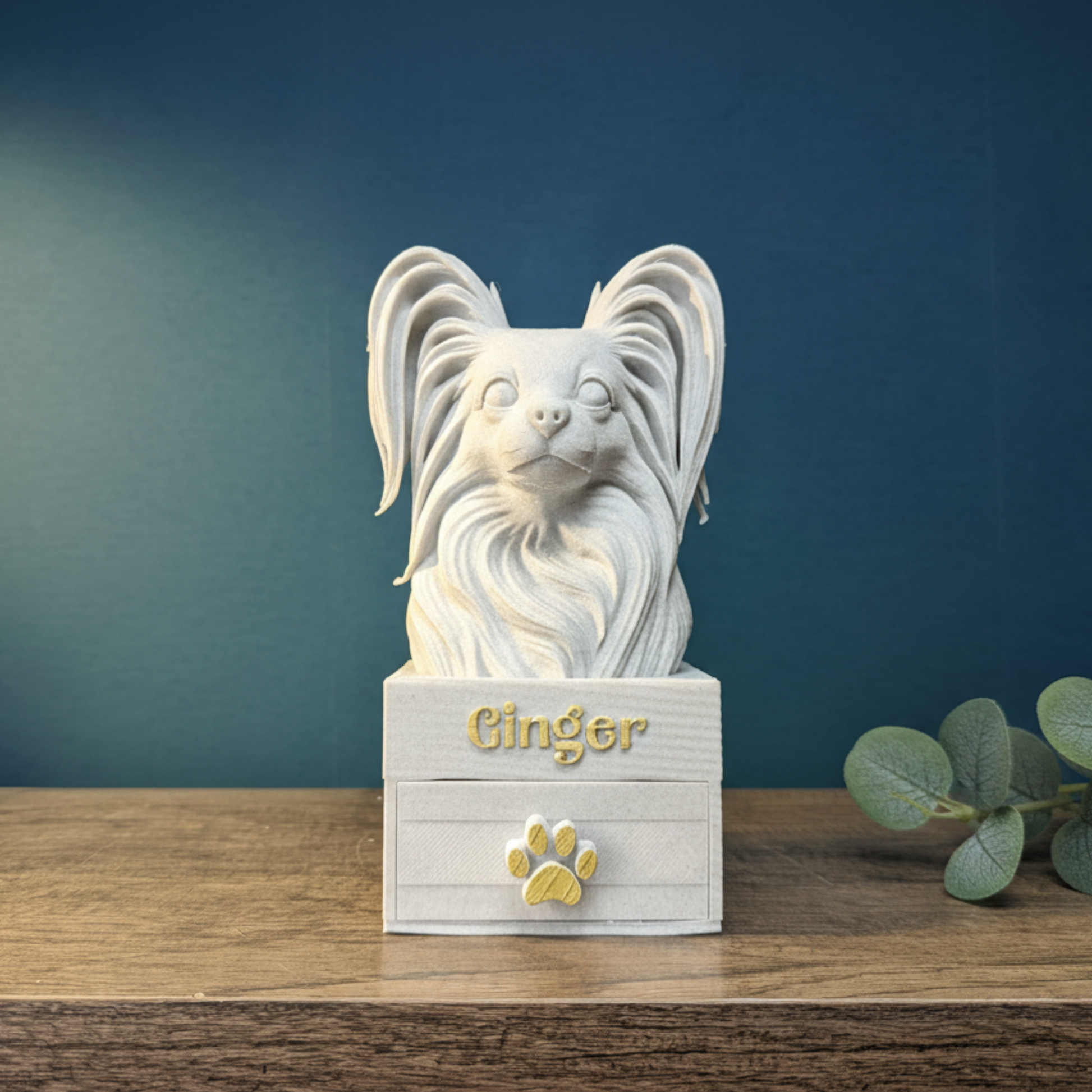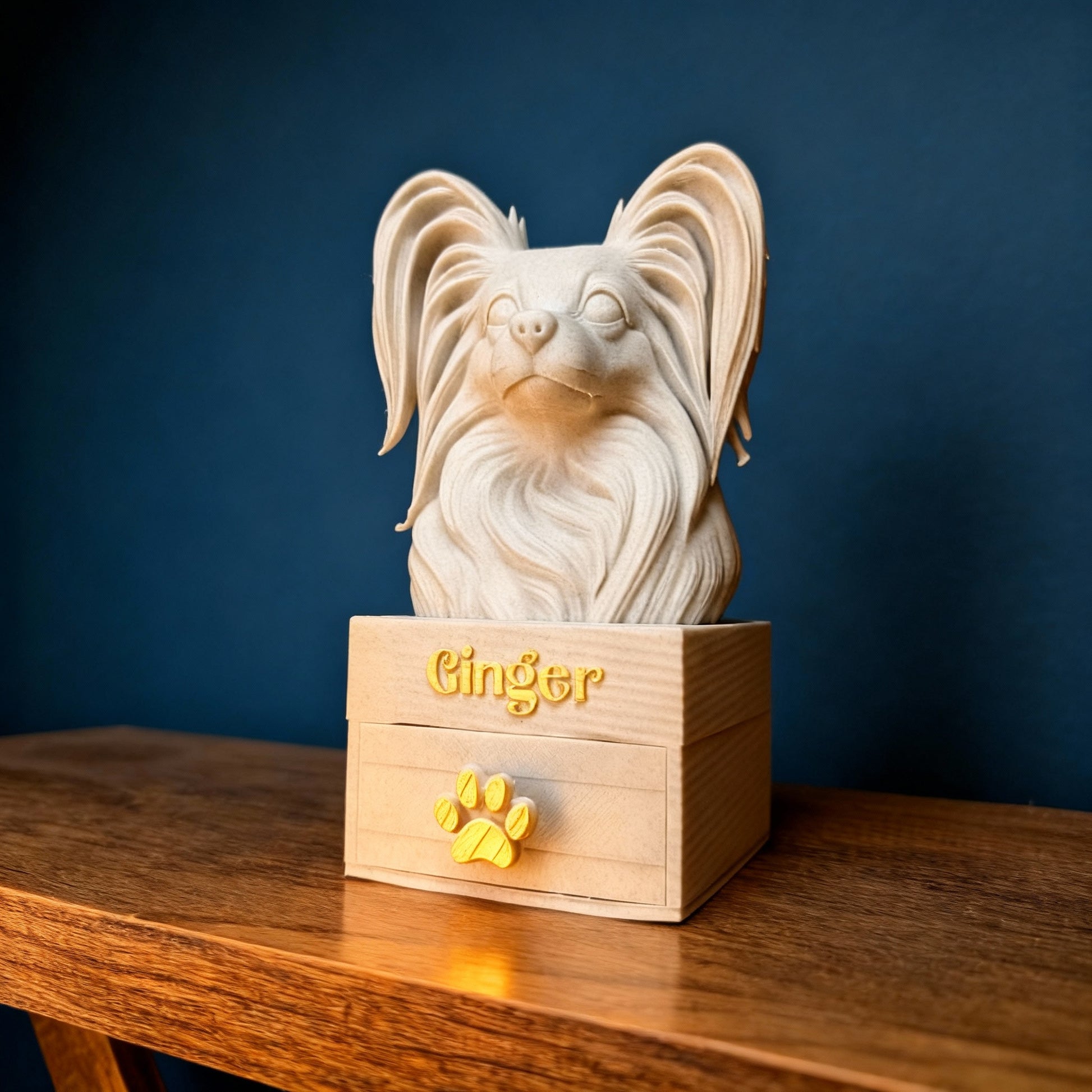 This custom pet bust sits atop a keepsake box with your pet's engraved name. Send a photo, approve the proof within 48 hours, and we craft a 25 cm memorial finished with gold lettering as standard.