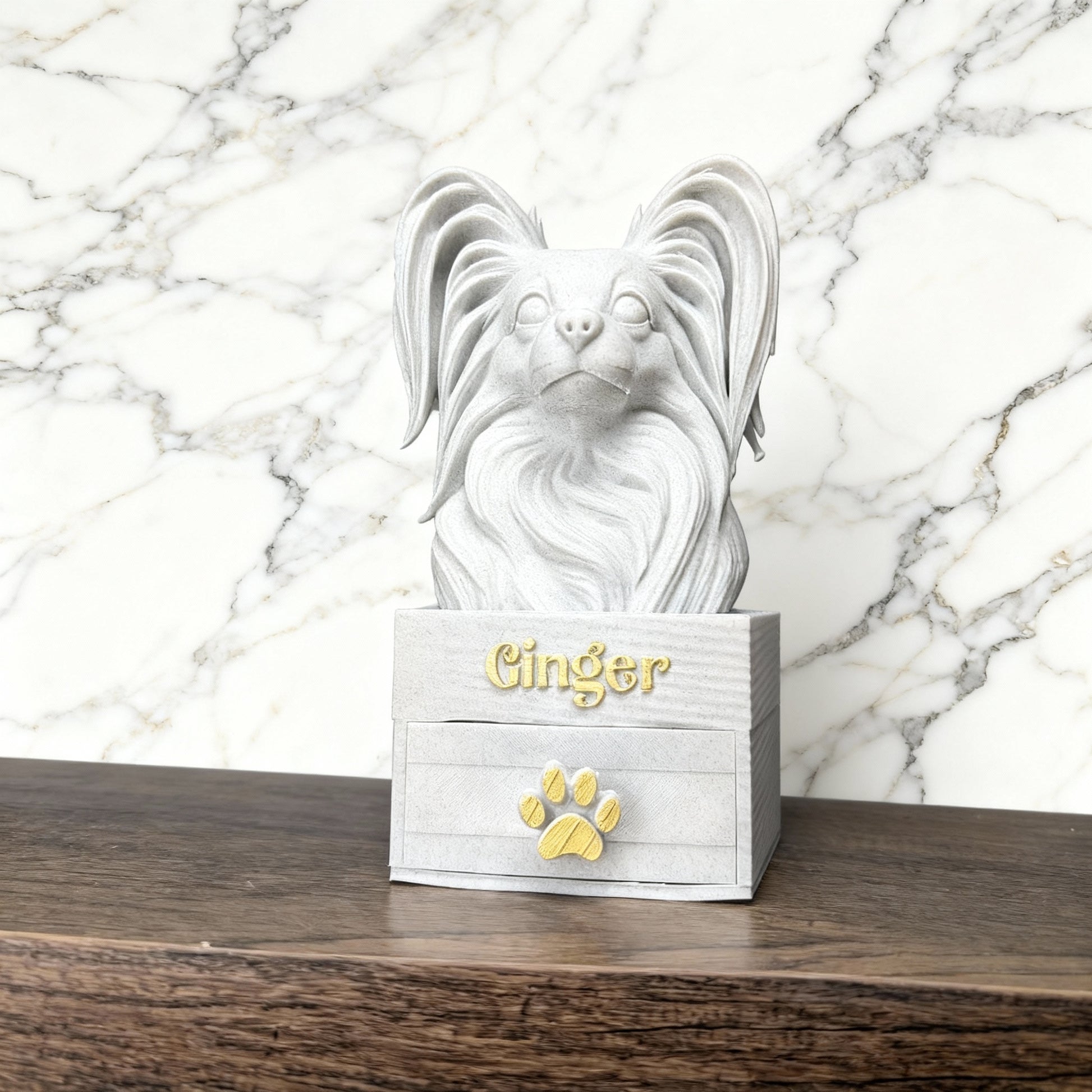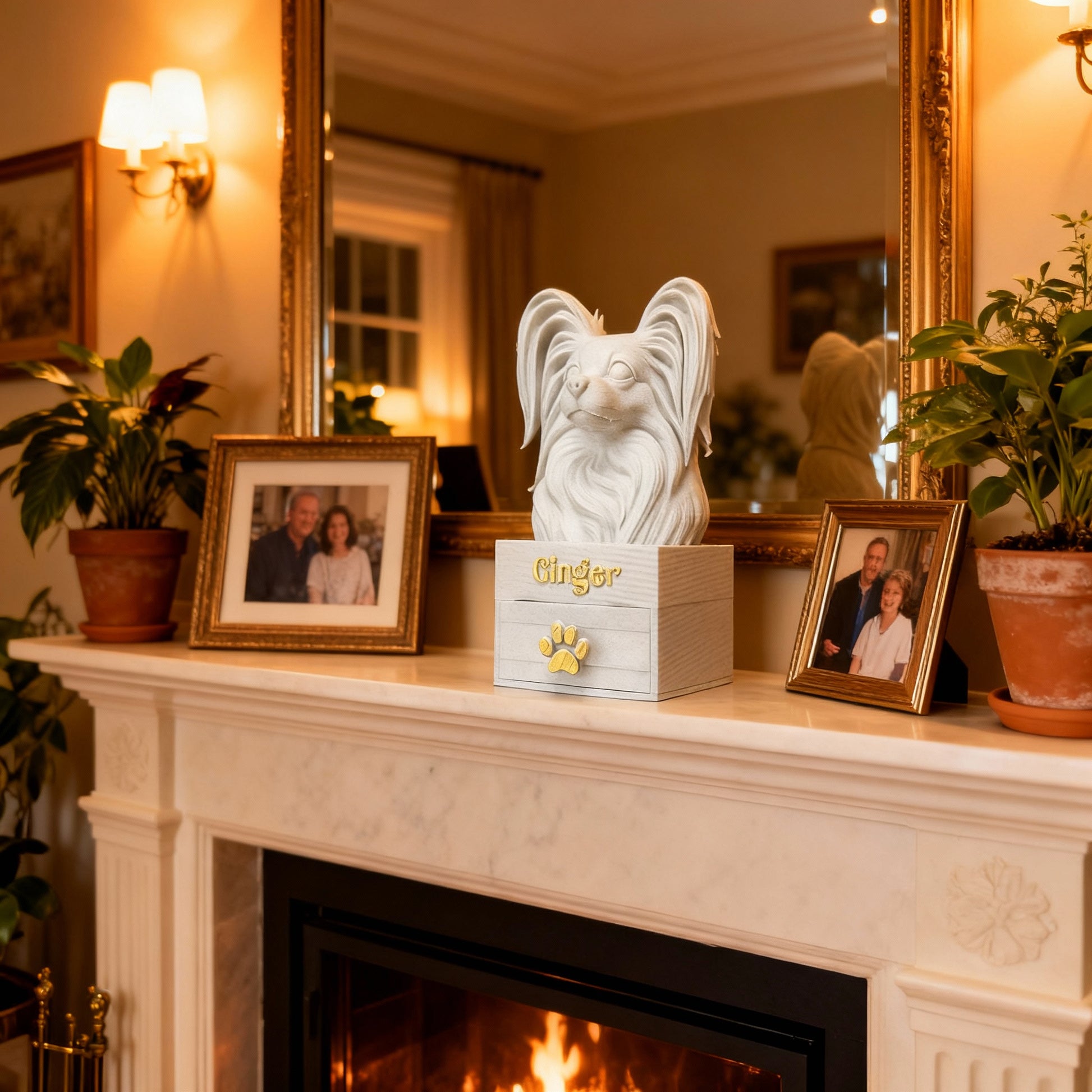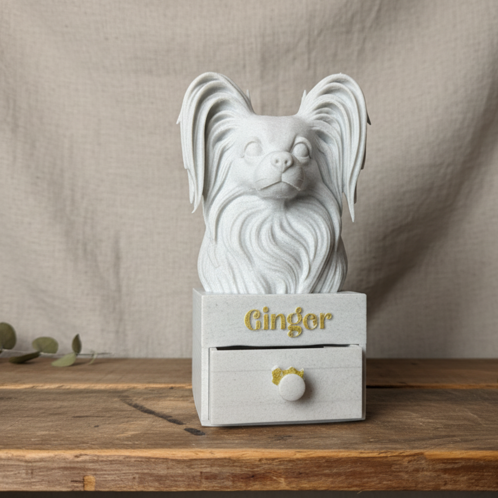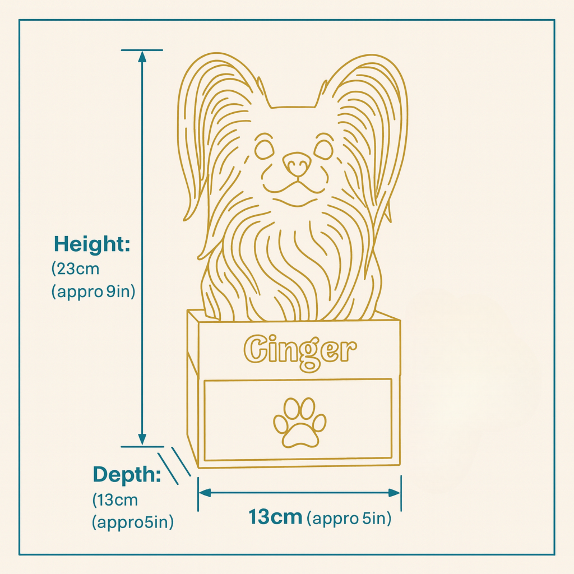 This custom pet bust sits atop a keepsake box with your pet's engraved name. Send a photo, approve the proof within 48 hours, and we craft a 25 cm memorial finished with gold lettering as standard.