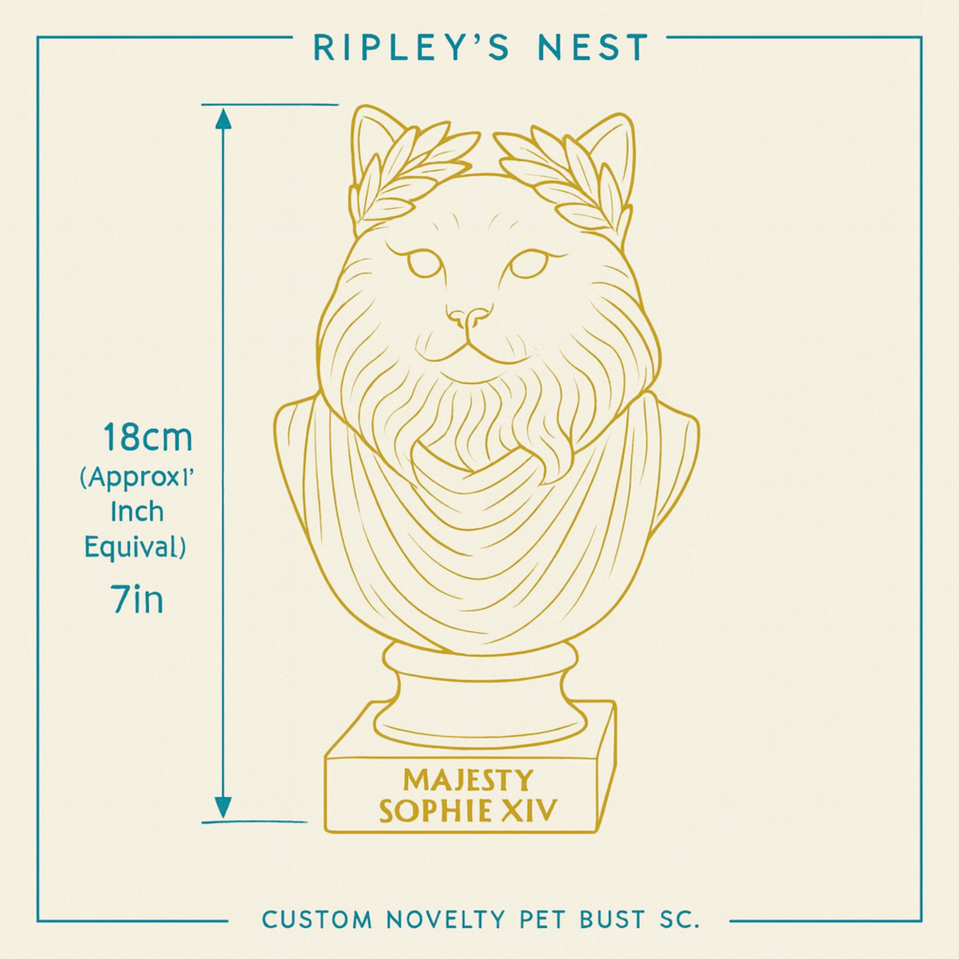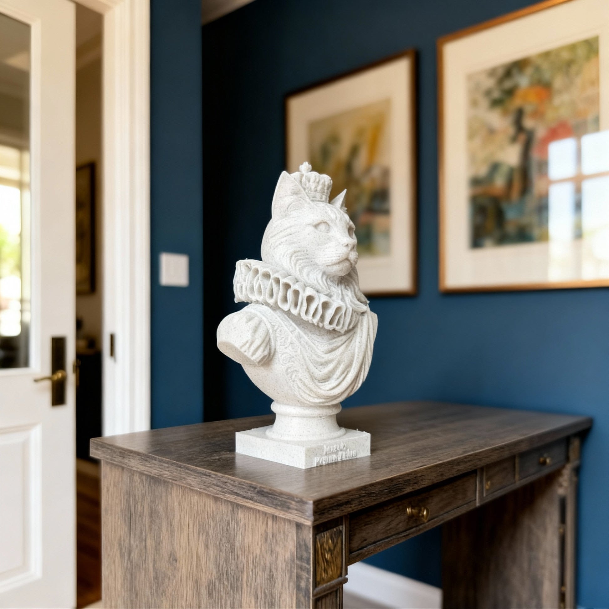 Order a custom pet bust from your photos. The piece is 18 cm tall and finished in a marble effect PLA. You can choose any theme, such as Caesar, Viking, or Chef.