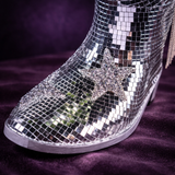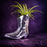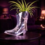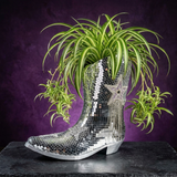 The Last Rodeo Disco Boot. A cast stone cowboy boot planter, hand-set with mirror tile mosaic from toe to heel, finished with a rhinestone star and a dark silver chain fringe down the shaft.