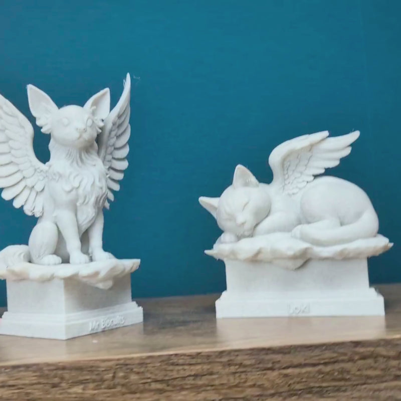 Honour your companion with a pet memorial made from your photos. Each piece is a custom pet bust with angel wings, a cloud base, and your pet’s name engraved on the plinth. Printed in marble effect PLA for a beautiful stone look.
