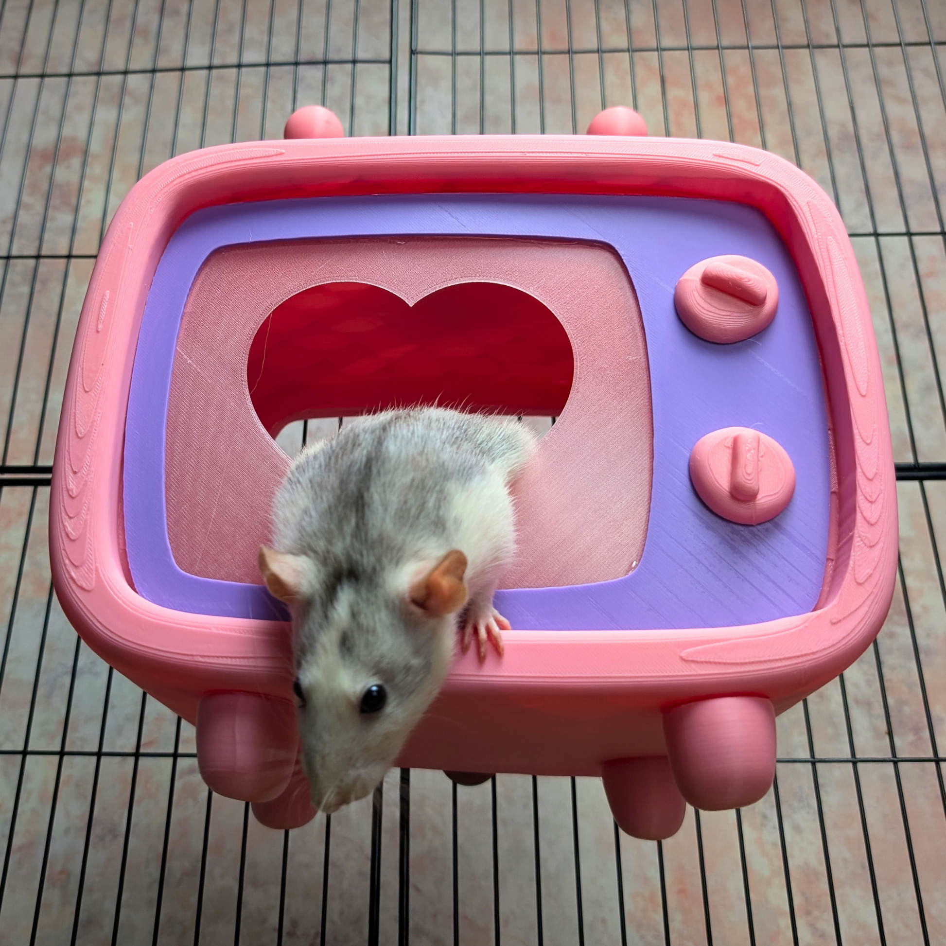 Give your furry friend the cutest spot in the house with this Retro TV Rat Hide, the perfect cozy cave for naps and play. Lovingly designed in my UK nest, this charming hideout provides a secure, enriching space for your pet, all while adding a splash of funky, retro style to their home. The heart-shaped screen is simply perfect for peeking out at their adoring audience (that's you!) and makes for the most adorable photos.