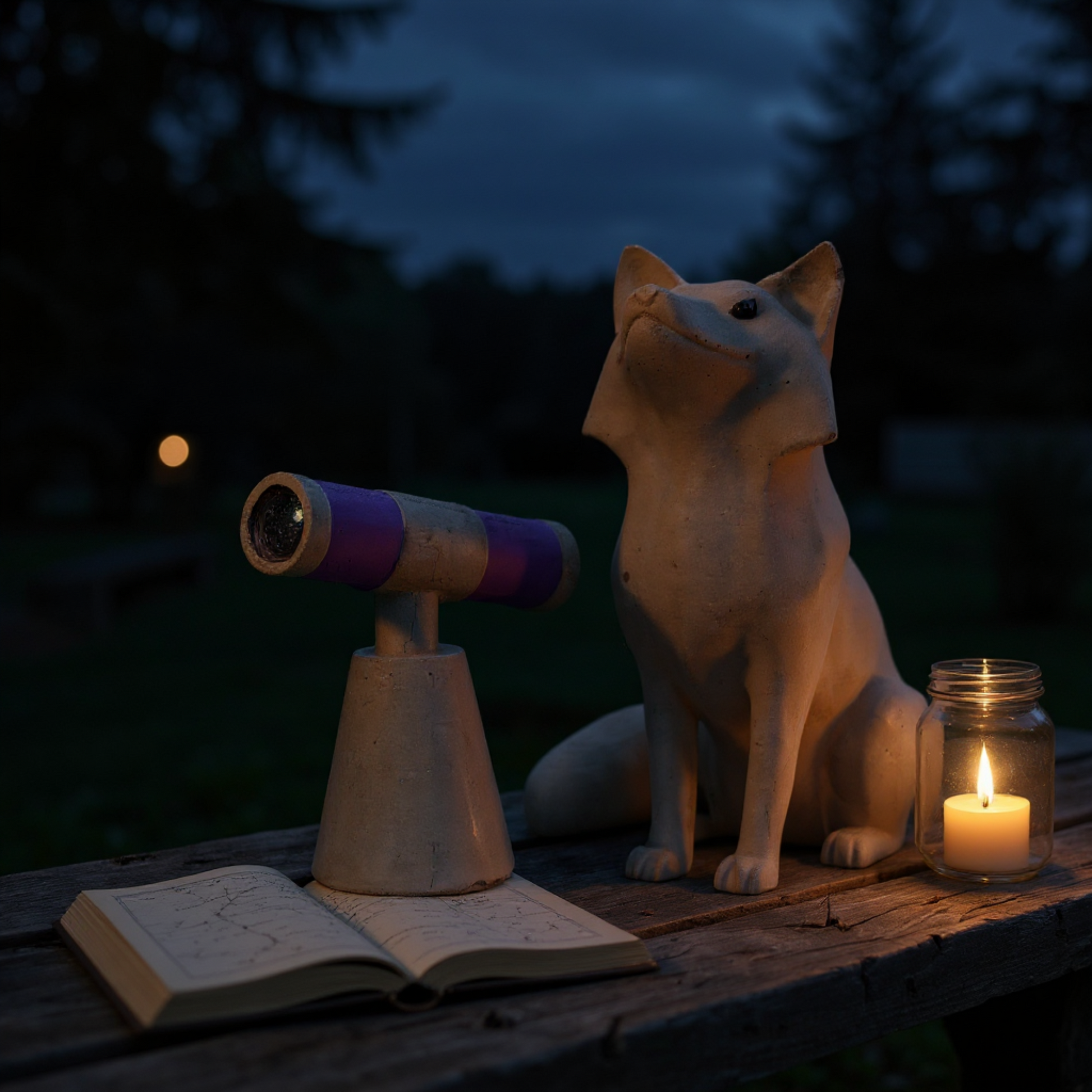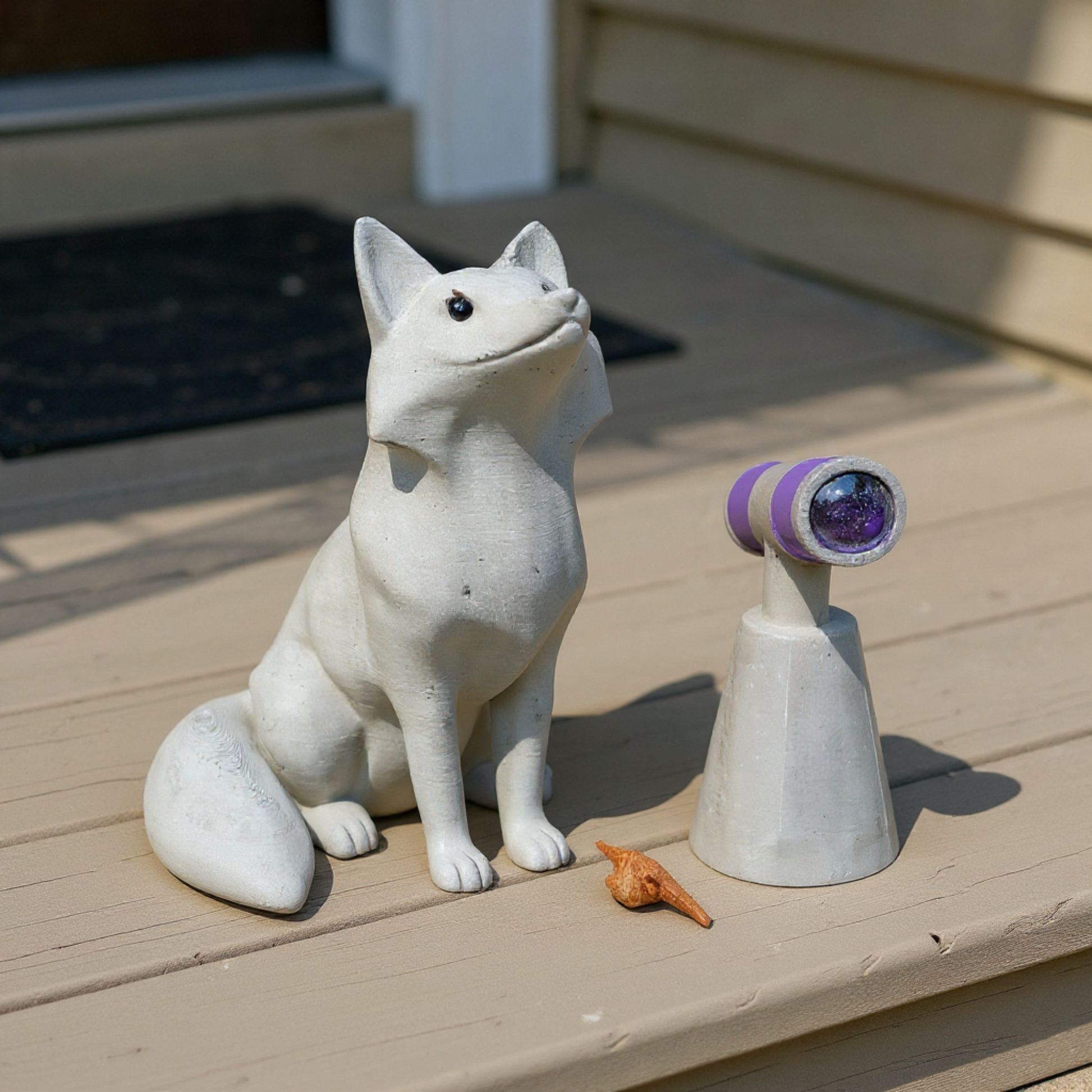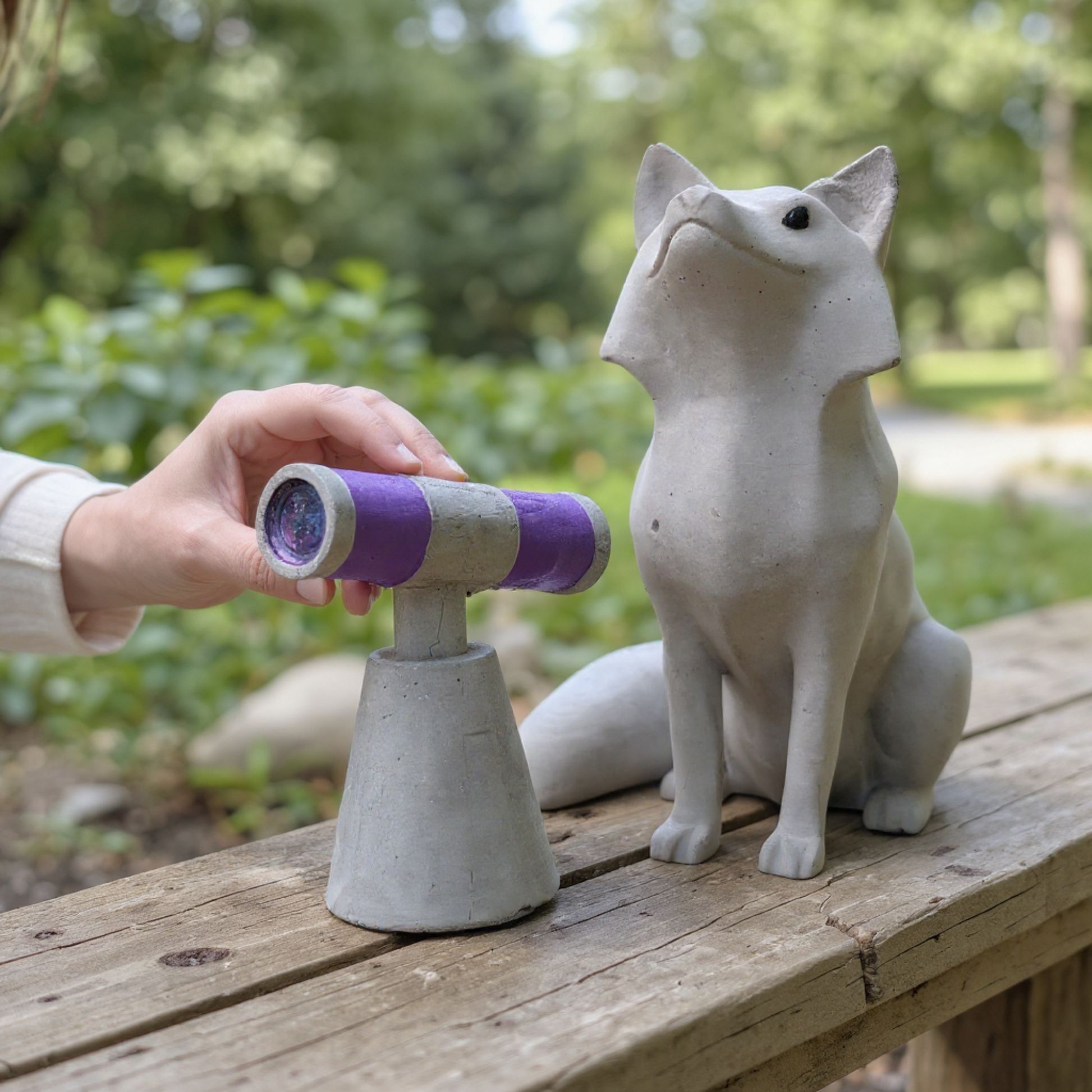 Discover a truly unique sculpture that tells a story. Our stargazing fox and telescope duo is a piece of handmade stone art, perfect as a concrete garden ornament or an enchanting statement piece for your indoor decor. This artisan crafted set features a curious fox looking skyward and a charming telescope with a swirling, hand painted amethyst colours galaxy in its lens. An unforgettable anniversary gift or birthday gift, this stone animal pair brings a playful, mystical decor element to any modern home.