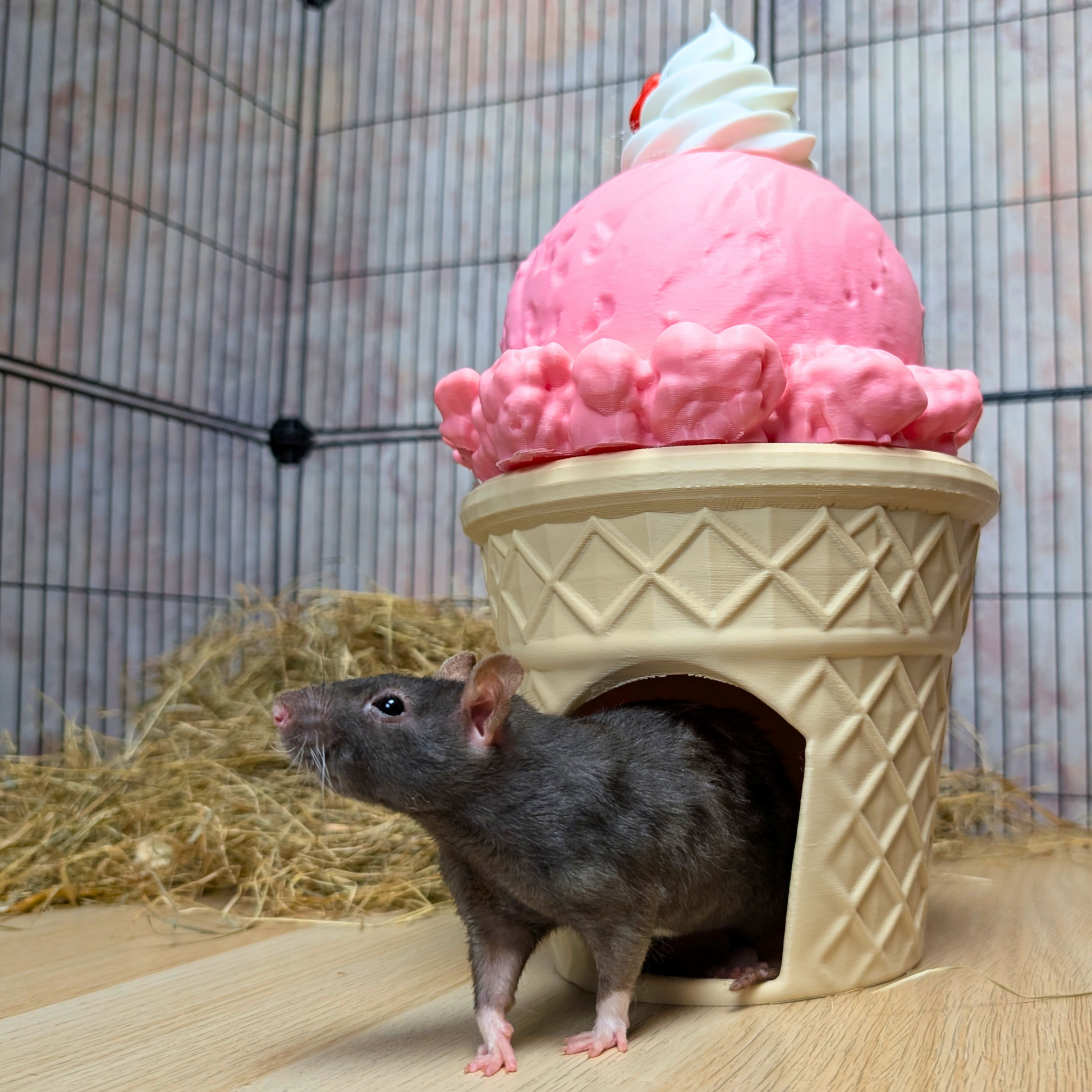 Surprise your furry friends with the ultimate cage upgrade! This adorable strawberry ice cream cone rat hide is the most charming retreat a pet could wish for, providing a wonderfully secure place for naps and snacks. Designed and brought to life in our UK workshop, each hide is 3D printed with artistic detail, bringing a scoop of joy and personality to their home that tells a story beyond a simple plastic igloo.